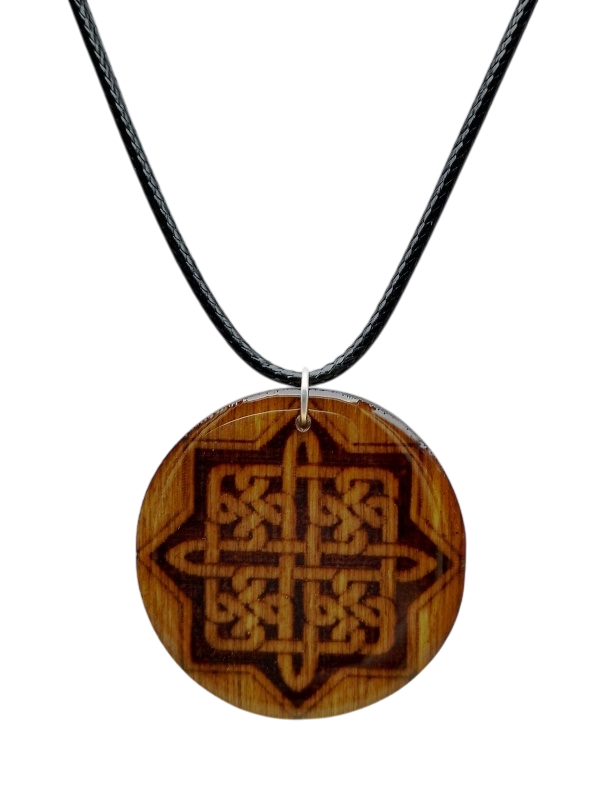 Փայտի վրա լազերով փորագրված «Նախշազարդ ՈՒթանկյուն»- ի պատկերով կախազարդ, որը պատված է ոսկերչական էպոքսիդային խեժով (ապակենման քար): Վզնոցի երկարությունը 45-51 սմ. է: Հնարավոր է ընտրել վզնոցի տարբեր գույներ: Հուշանվերը տեղադրված է փայտյա գեղեցիկ նվեր-տուփի մեջ: Զարդը պատրաստվում է ձեռքի աշխատանքի և նորարարական լազերային փորագրիչ սարքի համադրությամբ: