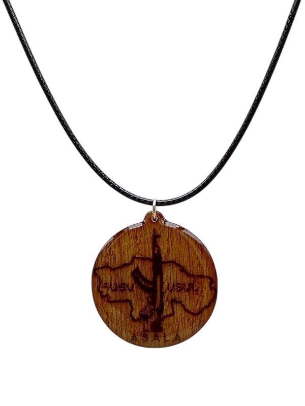 Փայտի վրա լազերով փորագրված «Հզոր Հայաստան»- ի պատկերով հուշանվեր, որը պատված է ոսկերչական էպոքսիդային խեժով (ապակենման քար): Վզնոցի երկարությունը 45-51 սմ. է: Հնարավոր է ընտրել վզնոցի տարբեր գույներ: Հուշանվերը տեղադրված է փայտյա գեղեցիկ նվեր-տուփի մեջ: Զարդը պատրաստվում է ձեռքի աշխատանքի և նորարարական լազերային փորագրիչ սարքի համադրությամբ: